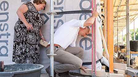 De bouw van de school en sporthal zijn al in volle gang. In juni 2025 vierden we het hoogste punt van de sporthal en werd ook de eerste steen gelegd voor de nieuwe school.